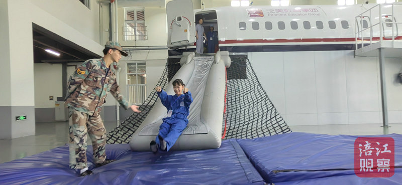 隨后的靜艙逃生演習更是將活動推向了高潮。在老師的鼓勵和耐心指導(dǎo)下,大家按照動作要點勇敢嘗試。只見孩子們從“飛機”上滑行而下,成功完成“逃生”,那一刻,他們臉上洋溢出自豪與喜悅。有的少年意猶未盡,甚至主動再次走上“飛機”,進行第二次體驗,在實踐中不斷鍛煉自己。