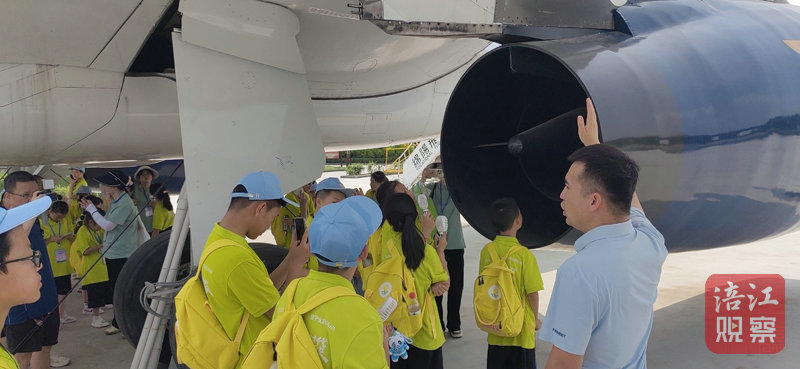 緊接著,少年們在老師的帶領(lǐng)下,近距離接觸“真飛機”?,F(xiàn)場互動氣氛熱烈,老師提出的關(guān)于飛機構(gòu)造的問題,如“飛機輪胎是空心的還是實心的”“飛機窗戶為什么是橢圓的”,引發(fā)了少年們的踴躍思考和回答。