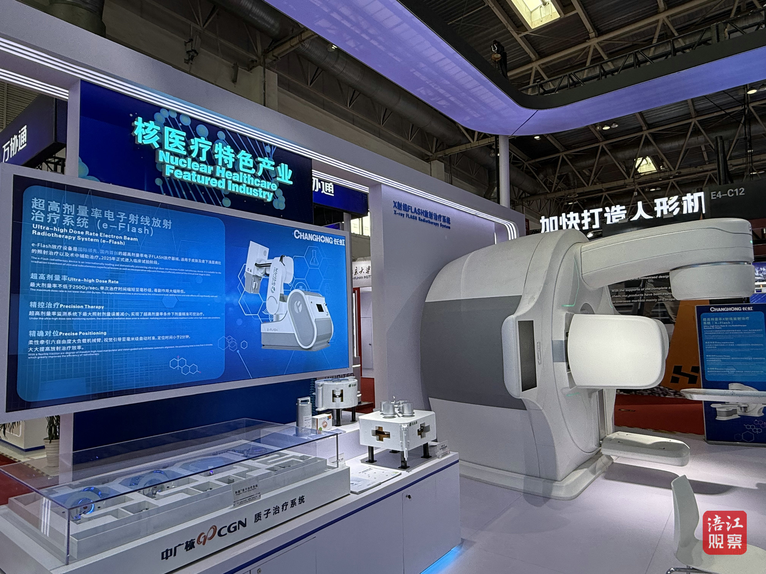 腫瘤治療一直是一大難題。長虹中玖閃光展出的超高劑量率X射線FLASH放射治療系統(tǒng)(X-Flash)為解決這一難題帶來了全新方案。據(jù)了解,X-Flash使用了創(chuàng)新的FLASH放療技術(shù),主要適用于多種深層實體腫瘤治療,它利用超高劑量率的射線進行瞬時照射,不僅能夠大幅降低放療副作用問題,并且單次照射時間小于一秒鐘,大大縮短治療周期。對于患者來說,其治療的痛苦與成本都有望降低,更能切實提高患者的生活質(zhì)量。