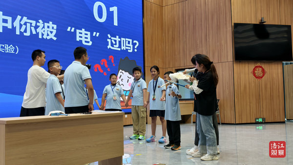 “同學們,見證奇跡的時刻到了!”在魔法靜電課堂上,一名營員用羊毛布摩擦塑料棒,產生的靜電在萊頓瓶中緩緩積蓄,另外十名營員手拉手圍成圓圈,當其中一名營員觸摸到充電后的金屬球時,電流瞬間傳遍“人體導電鏈”,驚呼聲與歡笑聲交織成一片。“電流非??焖俚貜奈业纳眢w里穿過了,感覺麻麻的!”臺下的營員們爭先恐后地舉起小手,想?yún)⒓酉乱唤M實驗的呼喊聲此起彼伏。