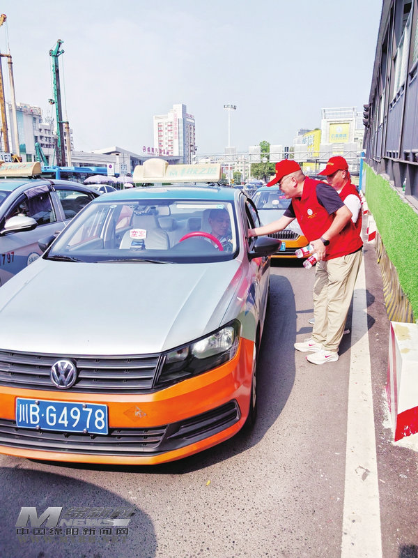 志愿者向出租車(chē)駕駛員發(fā)放降溫物資