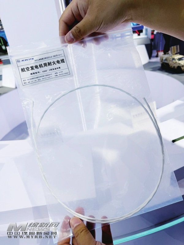 在綿陽展館的航空電子特色產(chǎn)業(yè)區(qū),一根細細的白色電纜,無論外觀還是手感都與普通電纜無明顯差異,卻有著一個響亮的名字——“航空發(fā)電機用耐火電纜”,也被稱為“1000℃特高溫電纜”。“高溫環(huán)境下,它的表面會形成陶瓷層,可耐受1100℃高溫火焰燃燒30分鐘。”四川九洲投資控股集團有限公司工作人員李玉琴介紹。