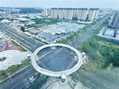 記者注意到,這座天橋的造型也很講究,外側(cè)的金屬側(cè)欄呈起伏狀。“因為地處三江片區(qū),天橋環(huán)形的橋體取意涪江蜿蜒的水脈,起伏式的鋁板幕墻則模擬了層疊山巒。”劉軍說。