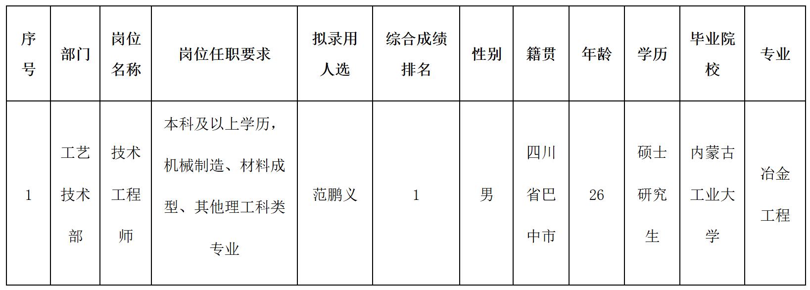 根據(jù)四川波鴻實(shí)業(yè)有限公司發(fā)布的招聘公告及招聘相關(guān)規(guī)定,經(jīng)面試、體檢等程序,擬錄用范鵬義同志到四川威斯卡特工業(yè)有限公司綿陽(yáng)分公司工作,現(xiàn)予以公示,具體情況如下: