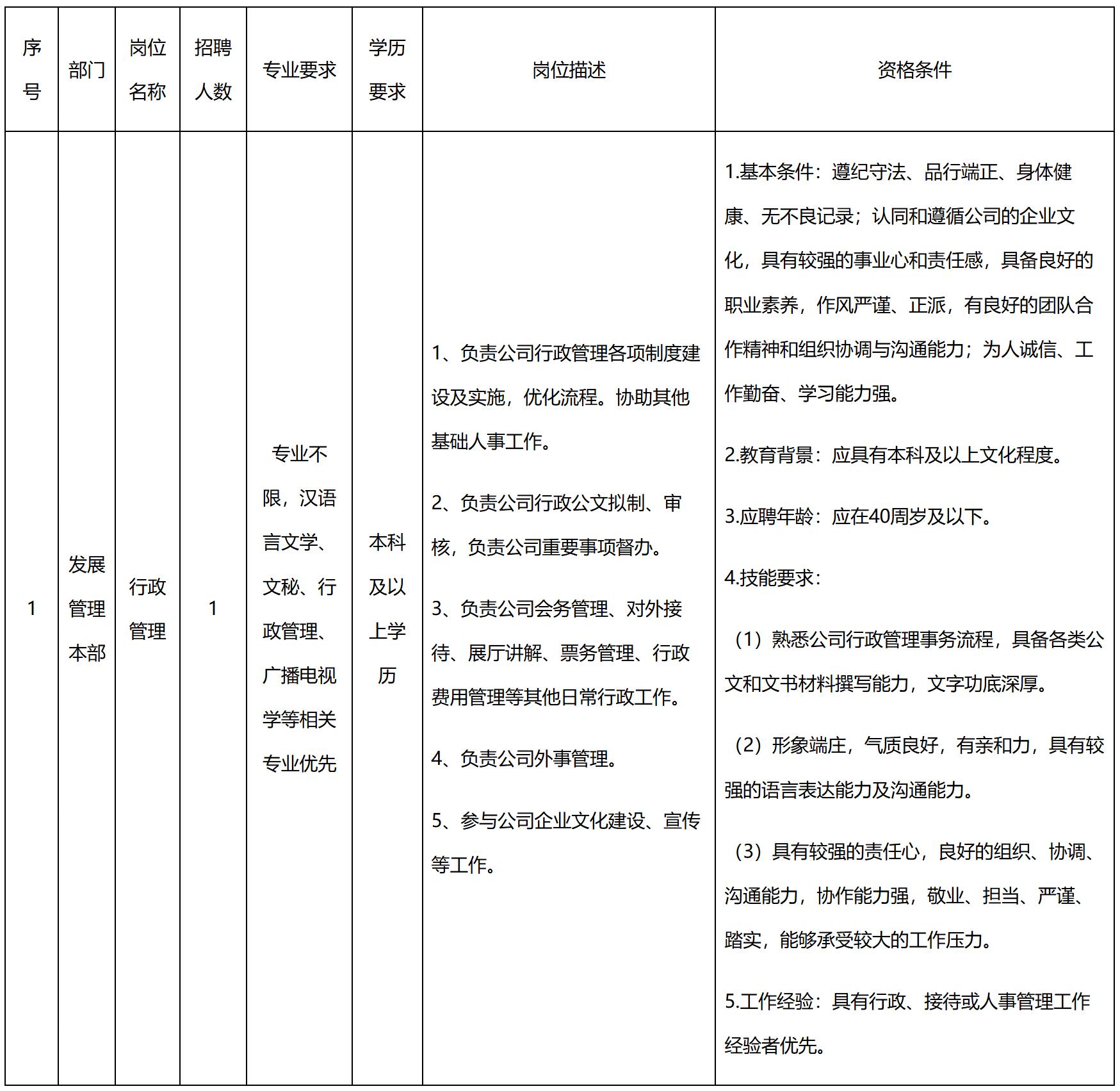 因經(jīng)營(yíng)業(yè)務(wù)需要,現(xiàn)公開(kāi)招聘行政人事管理1名,具體職責(zé)及要求如下: