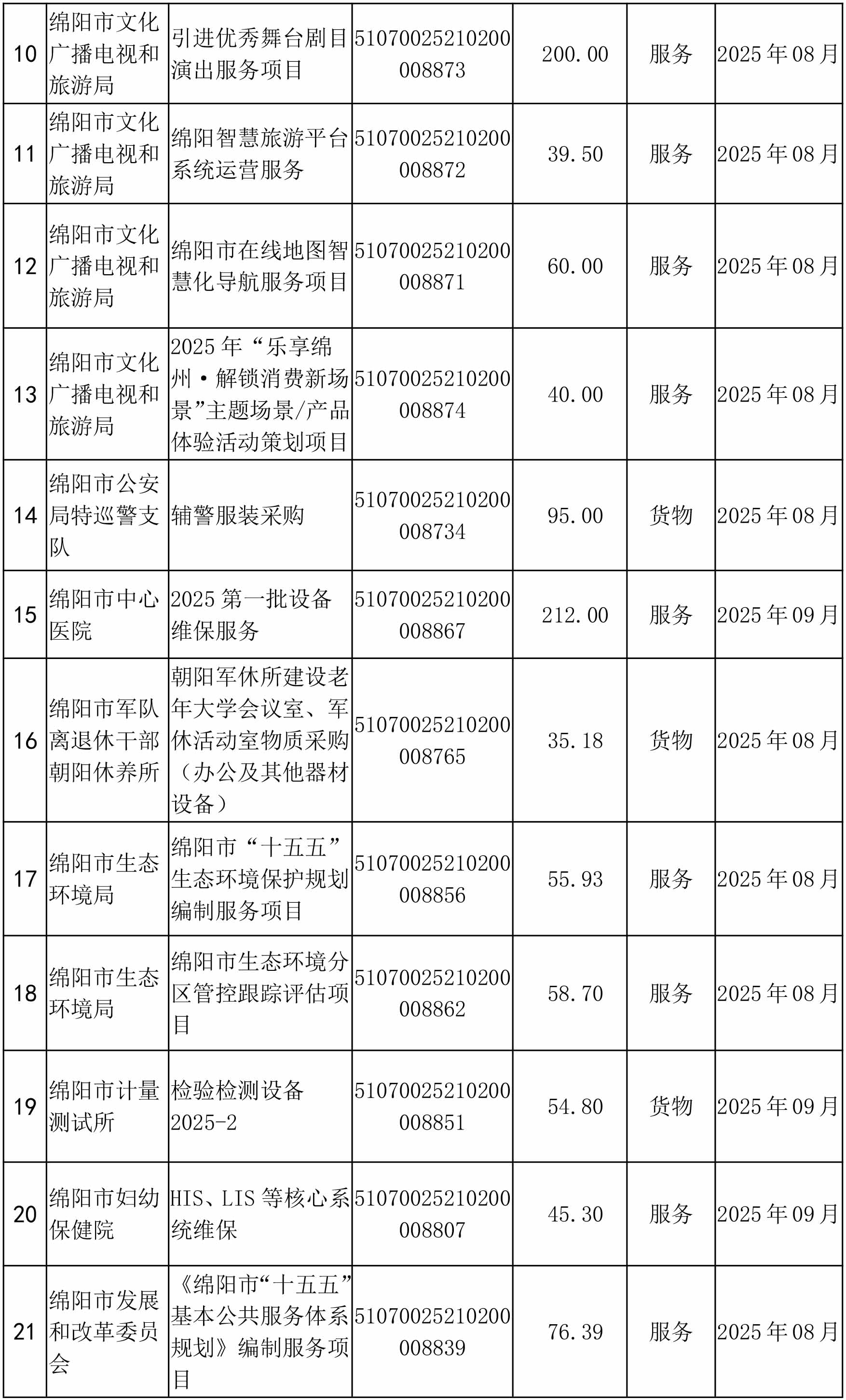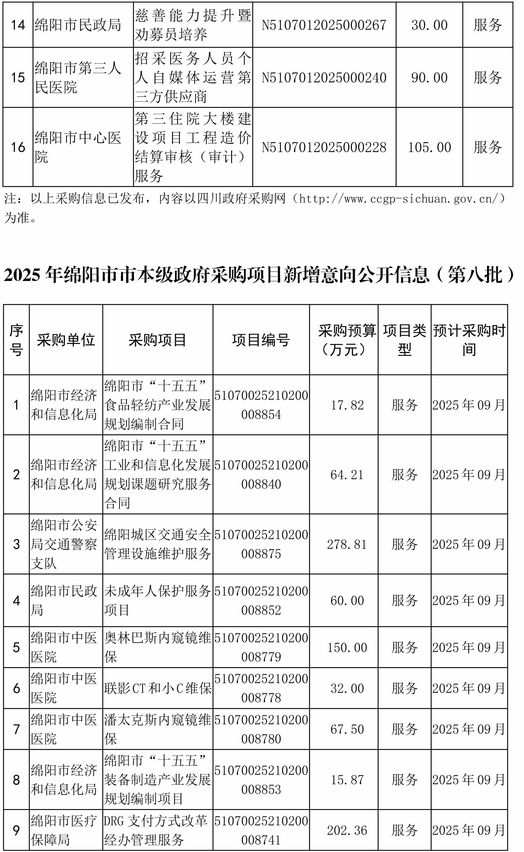 此批綿陽市市本級政府采購項目集中發(fā)布采購公告信息共計16個(于8月5日前已掛網(wǎng)),采購預算金額2952.48萬元,其中:貨物類項目6個,金額1073.25萬元;服務(wù)類項目10個,金額1879.23萬元。