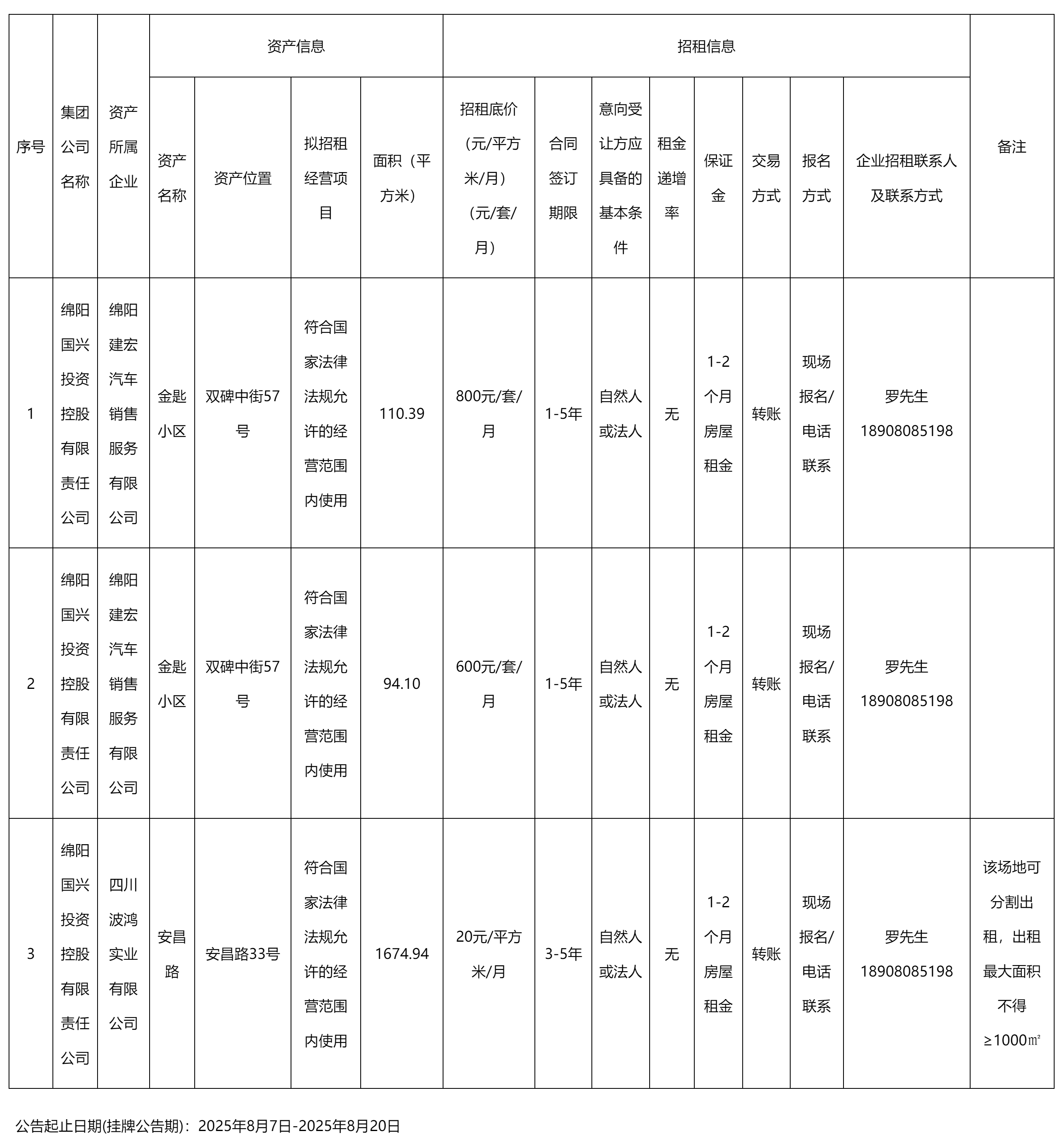 綿陽國興投資控股有限責(zé)任公司資產(chǎn)出租公告