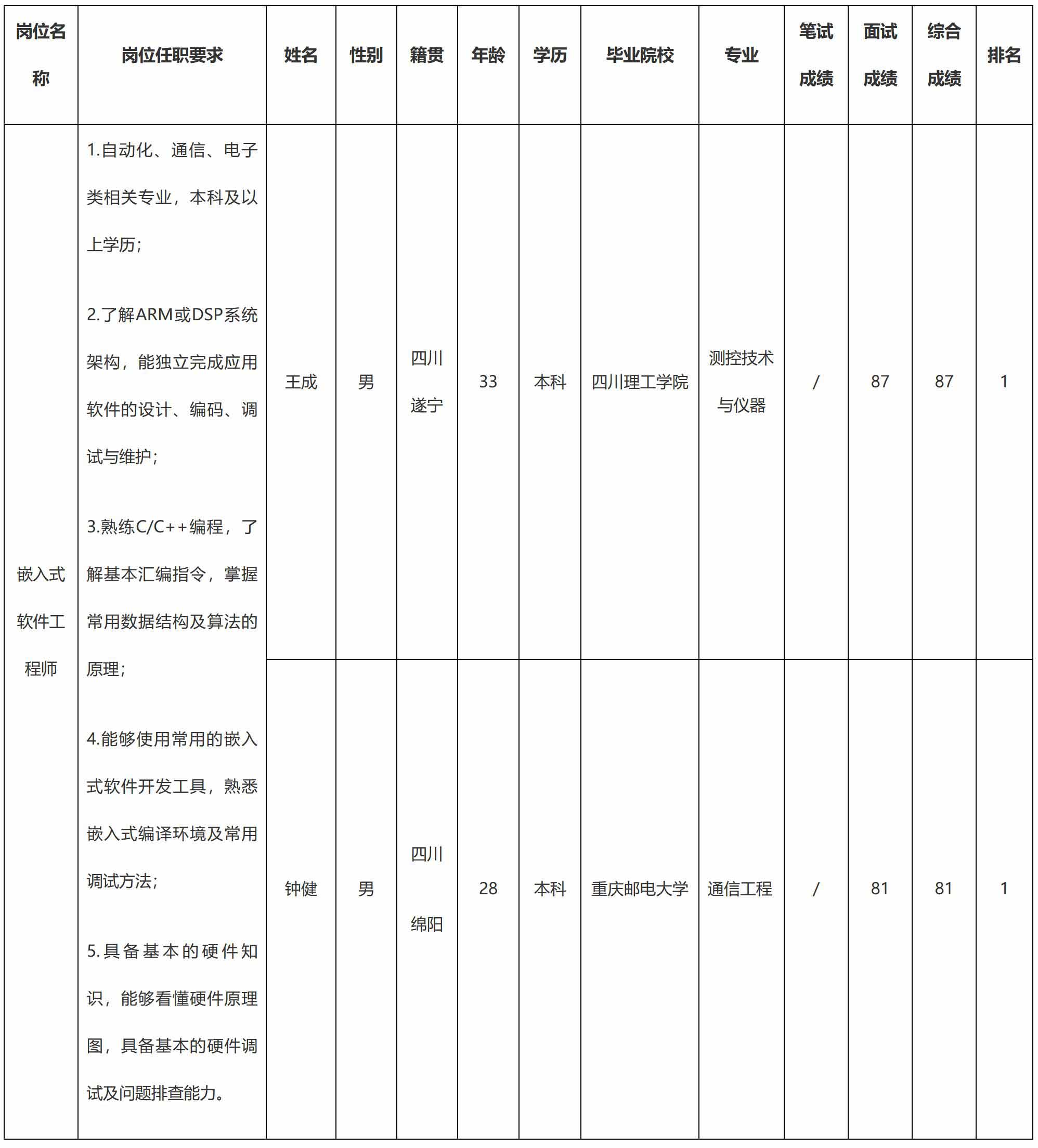 根據(jù)四川奧庫科技有限公司發(fā)布的招聘公告及招聘相關(guān)規(guī)定,經(jīng)面試等程序,現(xiàn)將面試成績予以公示。