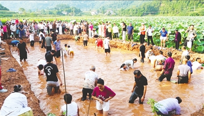 文藝演出結(jié)束后,一場趣味十足的“渾水摸魚”活動(dòng)吸引不少游客與村民踴躍參與。大家享受著抓魚的樂趣,抓到魚的興奮不已,沒有抓到魚的遺憾尖叫,池塘四周回蕩著游客與村民的歡聲笑語。