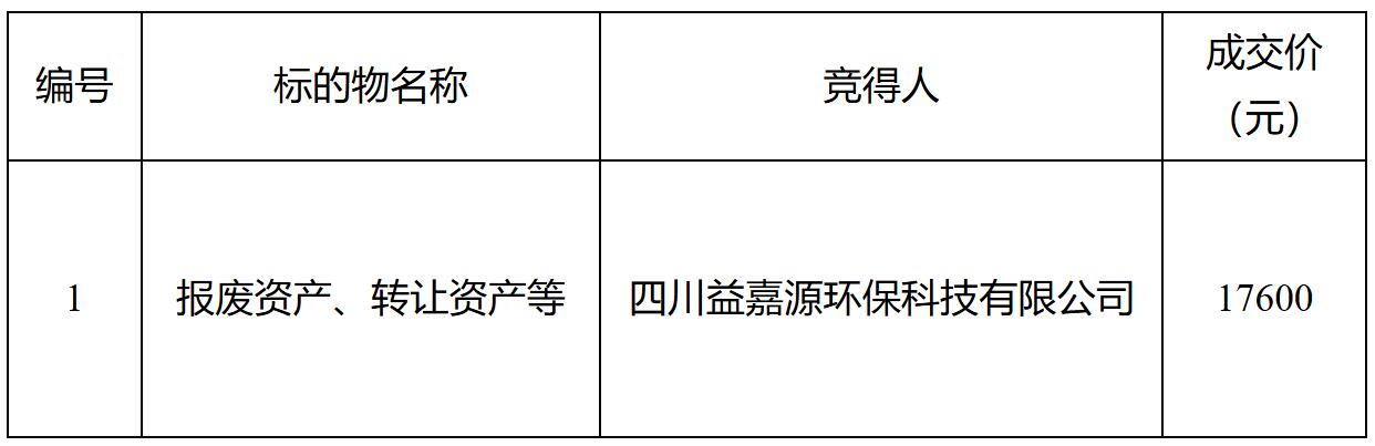 經(jīng)綿陽市財政局批準,我中心于2025年8月8日在全國公共資源交易服務(wù)平臺(四川省•綿陽市)電子交易系統(tǒng)網(wǎng)上競價方式公開處置“報廢資產(chǎn)、轉(zhuǎn)讓資產(chǎn)等固定資產(chǎn)”一批,現(xiàn)將成交結(jié)果公示如下:
