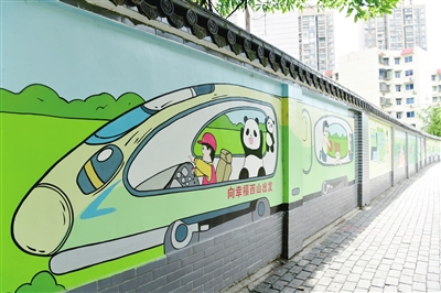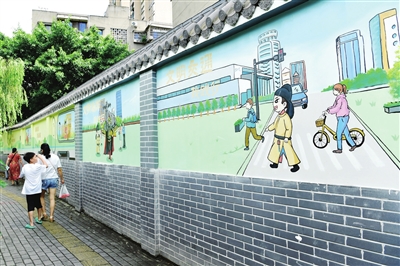 鄰里互助、光盤行動、文明遛犬、節(jié)約水電、移風易俗、消防安全、文明旅游、垃圾分類……近日,記者在涪城區(qū)宇虹北街西二巷平政河畔看到,河岸一側(cè)長約400米的圍墻上,描繪著數(shù)十幅色彩亮麗的主題彩繪組成的“文明號高速動車”。每段墻繪即是一堂文明課,內(nèi)容豐富,生動有趣,兼具藝術(shù)美感,與古樸青灰色調(diào)的滴水瓦、墻體相映成景,成為居民身邊一道靚麗的文明風景線。 (記者 王勇 攝影報道)