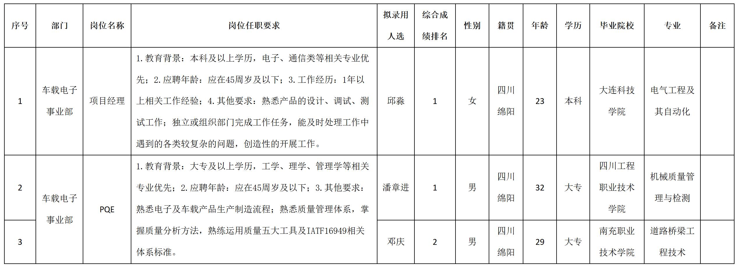 根據(jù)四川九州電子科技股份有限公司發(fā)布的招聘公告及招聘相關規(guī)定,經(jīng)筆試、面試、考察、體檢等程序,擬錄用邱淼等3名同志到四川九州電子科技股份有限公司工作,現(xiàn)予以公示,具體情況如下: