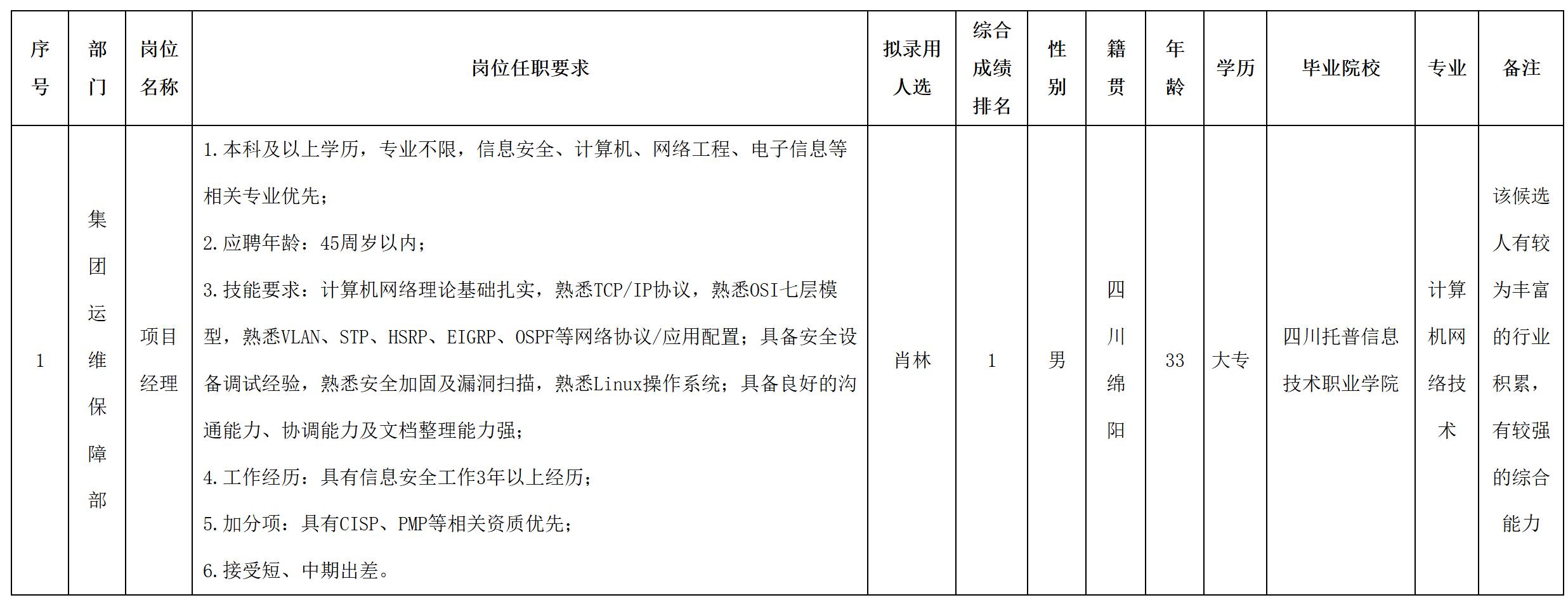 根據(jù)四川虹信軟件股份有限公司發(fā)布的招聘公告及招聘相關(guān)規(guī)定,經(jīng)面試、考察、體檢等程序,擬錄用肖林同志到四川虹信軟件股份有限公司工作,現(xiàn)予以公示,具體情況如下: