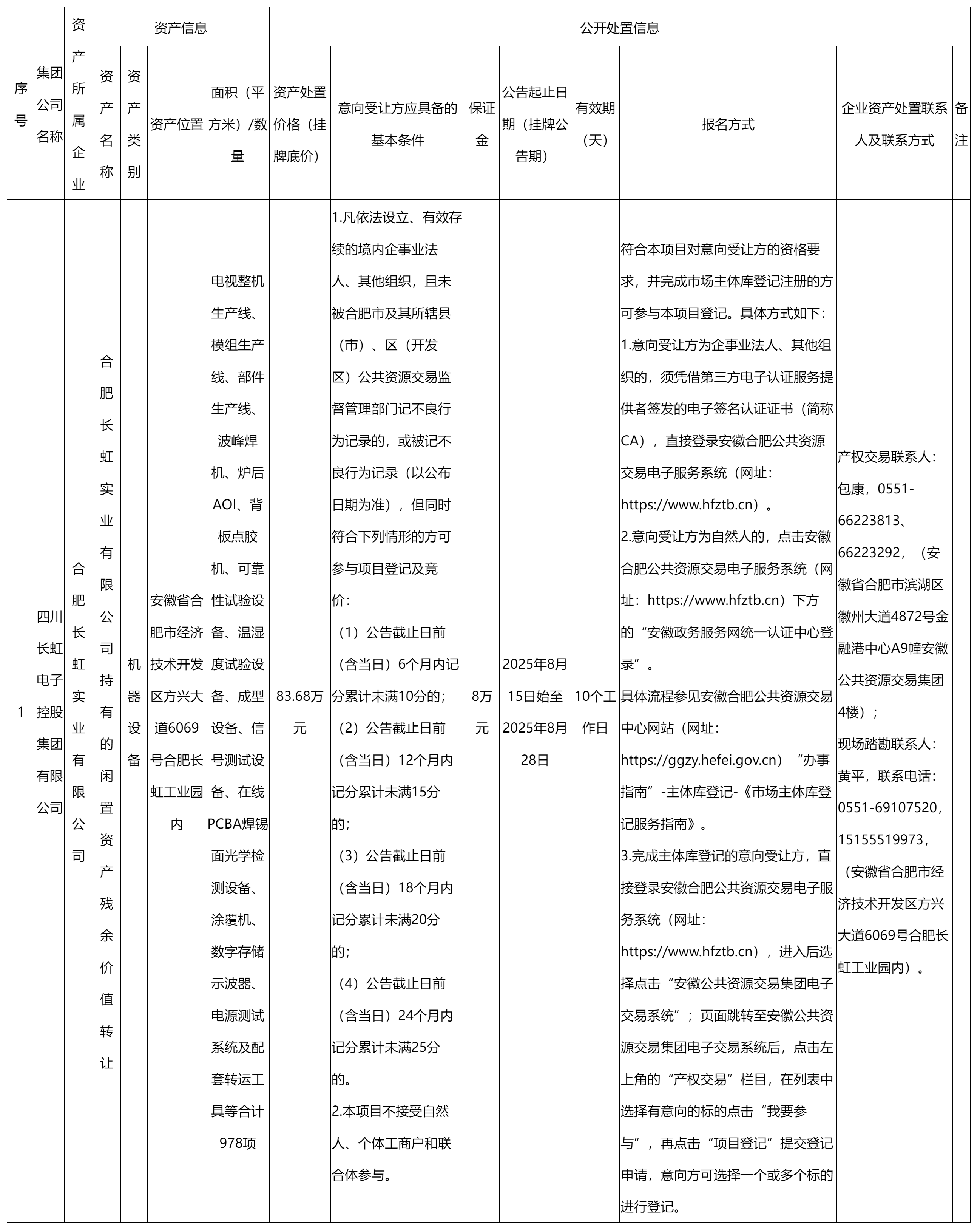 合肥長虹實業(yè)有限公司閑置資產(chǎn)處置公告
