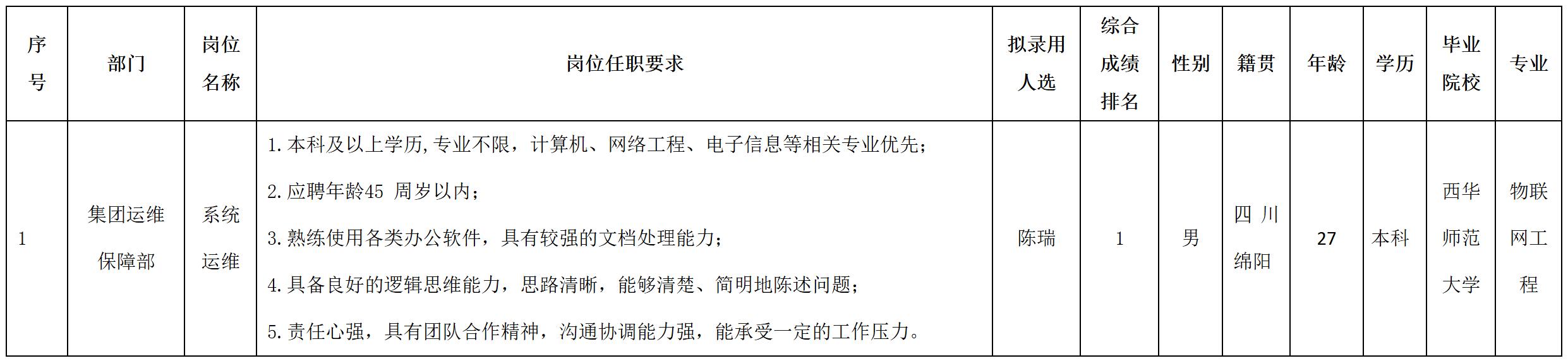 根據(jù)四川虹信軟件股份有限公司發(fā)布的招聘公告及招聘相關規(guī)定,經(jīng)面試、考察、體檢等程序,擬錄用陳瑞同志到四川虹信軟件股份有限公司工作,現(xiàn)予以公示,具體情況如下: