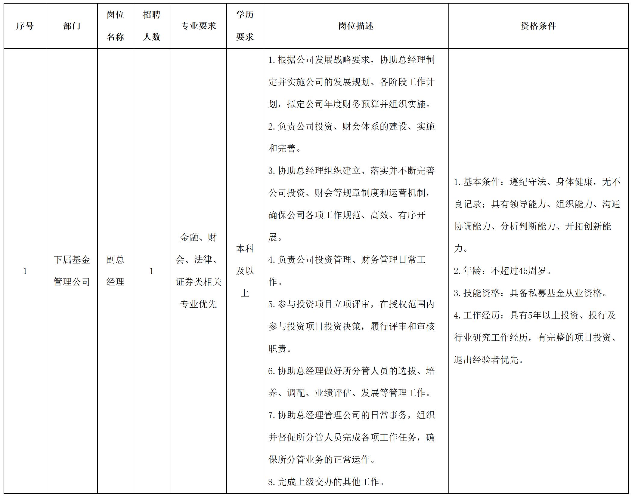 現(xiàn)根據(jù)經(jīng)營(yíng)管理需要,公開(kāi)選聘下屬基金管理公司副總經(jīng)理一名(基層干部,工作地點(diǎn):成都):
