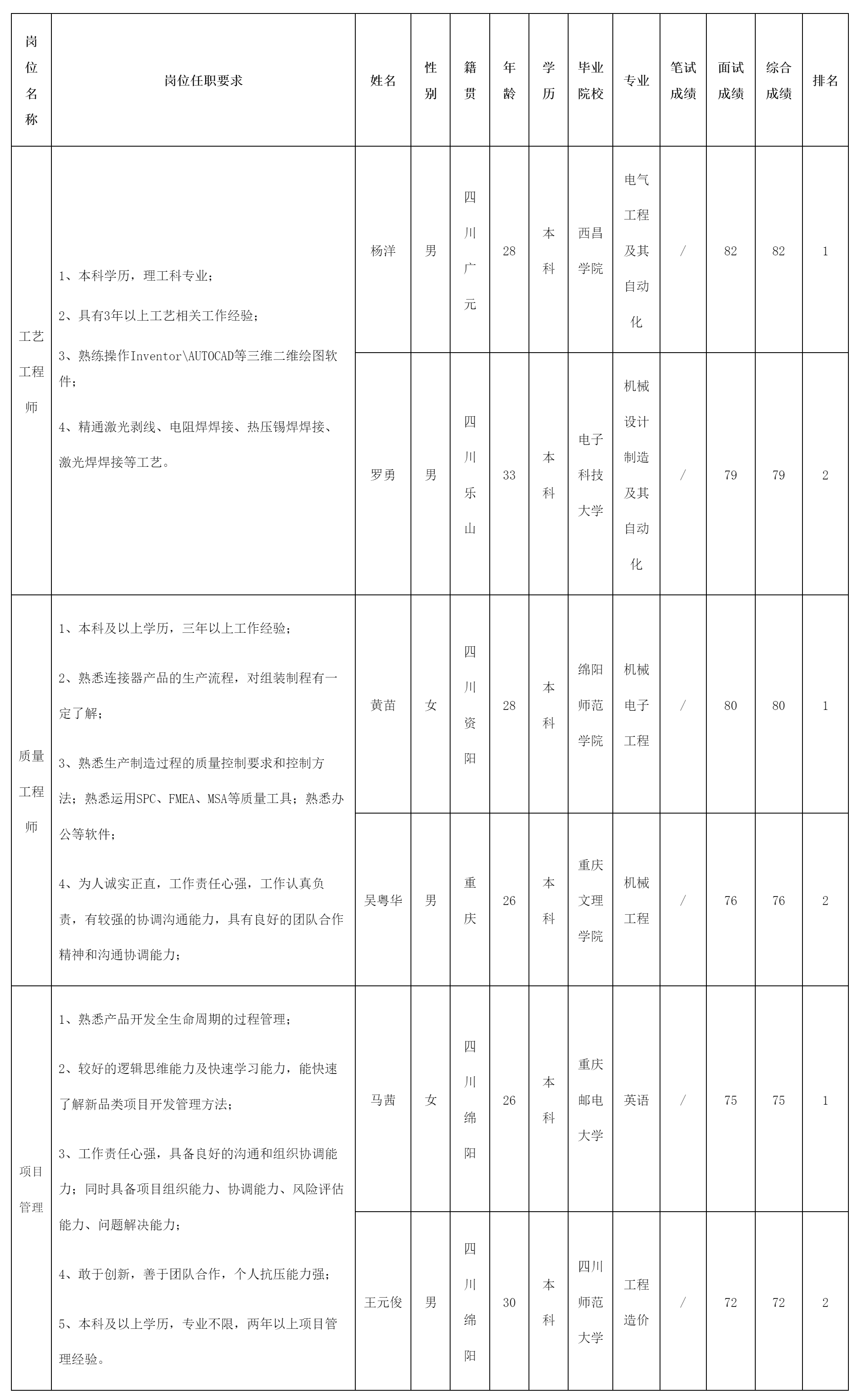 根據四川華豐科技股份有限公司發(fā)布的招聘公告及招聘相關規(guī)定,經筆試、面試等程序,現(xiàn)將筆試(面試)成績予以公示。