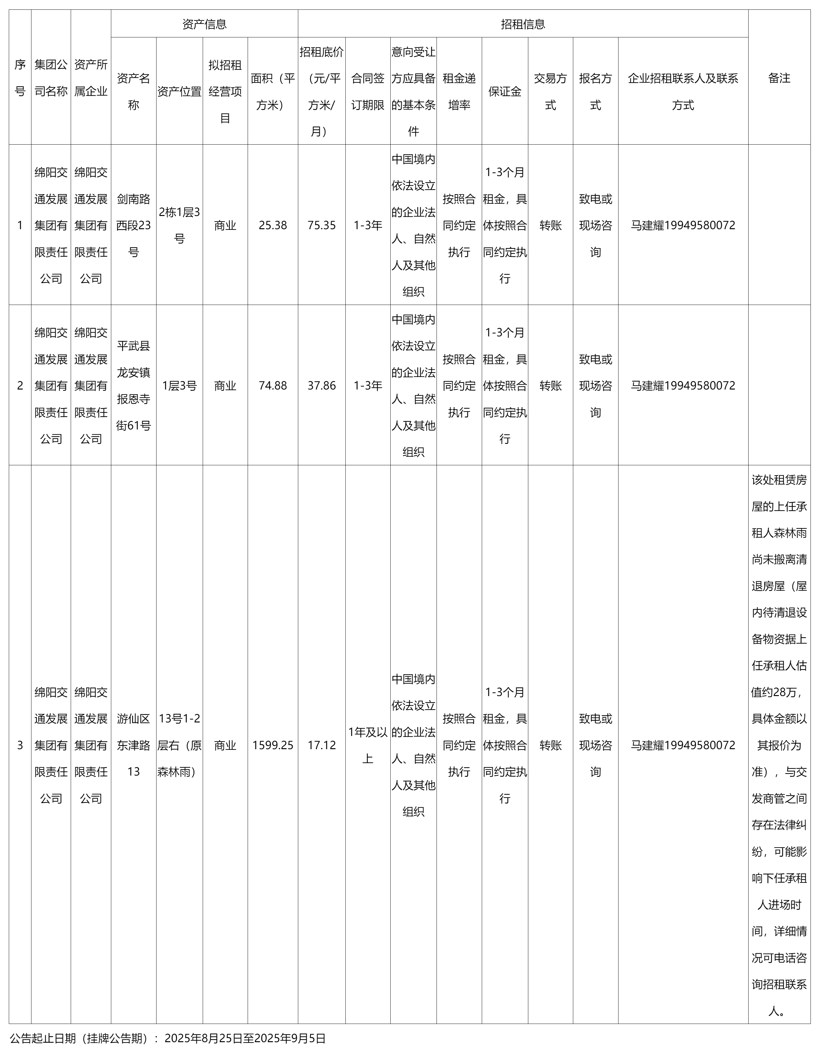 綿陽交發(fā)實業(yè)有限責任公司涪城區(qū)、游仙區(qū)與平武縣部分資產招租公告