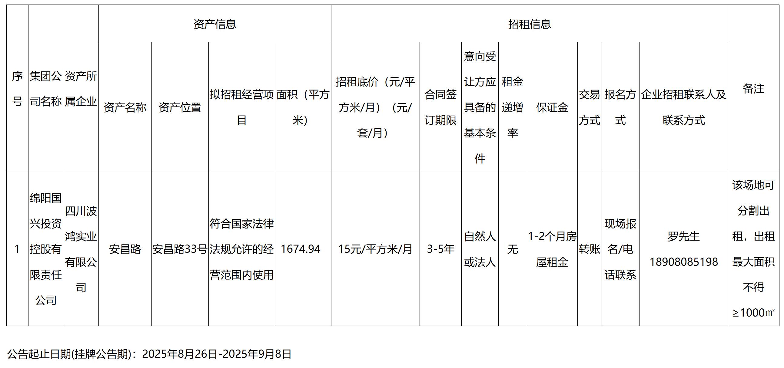 綿陽國興投資控股有限責(zé)任公司資產(chǎn)出租公告