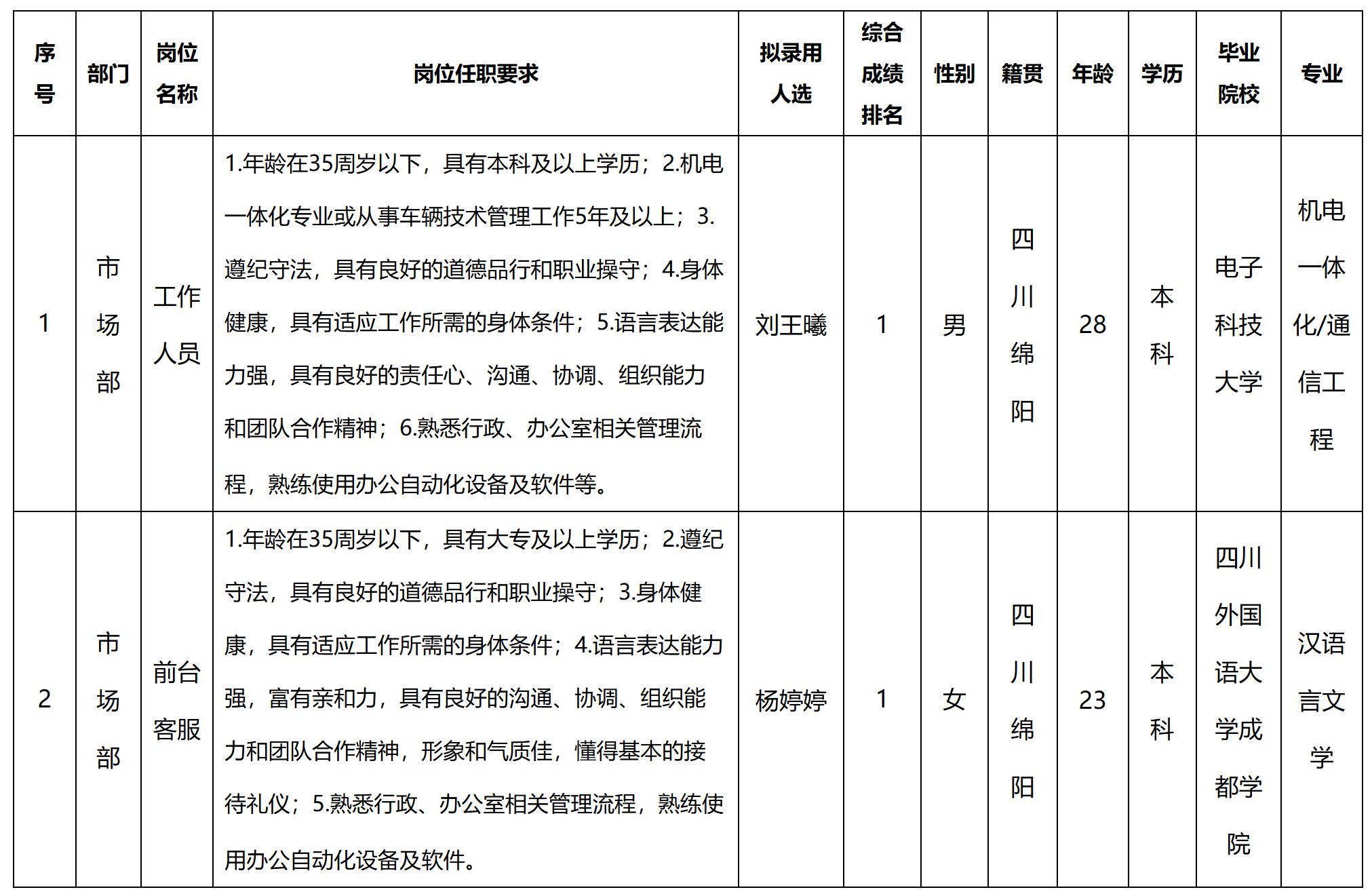 根據(jù)綿陽市公交遠(yuǎn)航汽車服務(wù)有限責(zé)任公司發(fā)布的招聘公告及招聘相關(guān)規(guī)定,經(jīng)筆試、面試、考察、體檢等程序,擬錄用劉王曦等同志到綿陽市公交遠(yuǎn)航汽車服務(wù)有限責(zé)任公司工作,現(xiàn)予以公示,具體情況如下: