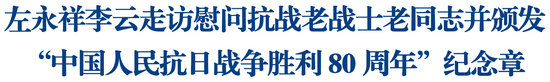 綿陽新聞網(wǎng)訊 今年是中國人民抗日戰(zhàn)爭暨世界反法西斯戰(zhàn)爭勝利80周年。近日,省委常委、市委書記左永祥,市委副書記、市長李云走訪慰問抗戰(zhàn)老戰(zhàn)士、老同志,并頒發(fā)“中國人民抗日戰(zhàn)爭勝利80周年”紀念章,代表市委、市政府向全市抗戰(zhàn)老戰(zhàn)士、老同志致以崇高敬意和誠摯問候。