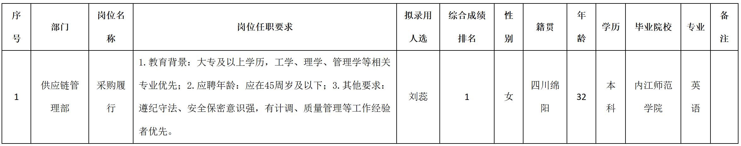 根據(jù)四川九州電子科技股份有限公司發(fā)布的招聘公告及招聘相關(guān)規(guī)定,經(jīng)筆試、面試、考察、體檢等程序,擬錄用劉蕊同志到四川九州電子科技股份有限公司工作,現(xiàn)予以公示,具體情況如下: