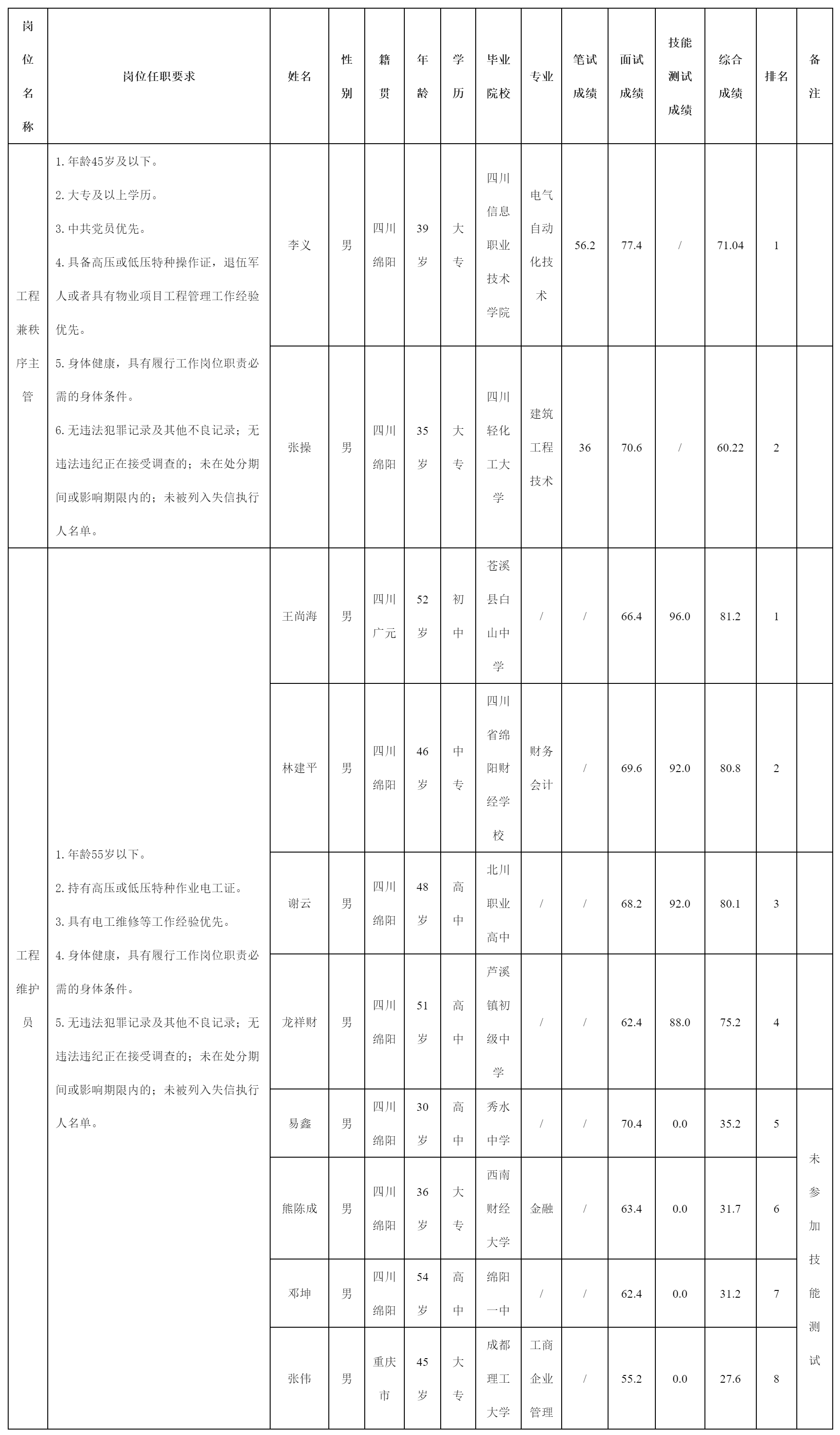 根據(jù)綿陽科發(fā)商業(yè)服務(wù)有限公司(原綿陽科發(fā)物業(yè)服務(wù)有限公司)發(fā)布的招聘公告及招聘相關(guān)規(guī)定,經(jīng)開展筆試、面試等程序,現(xiàn)將測(cè)試成績(jī)予以公示。