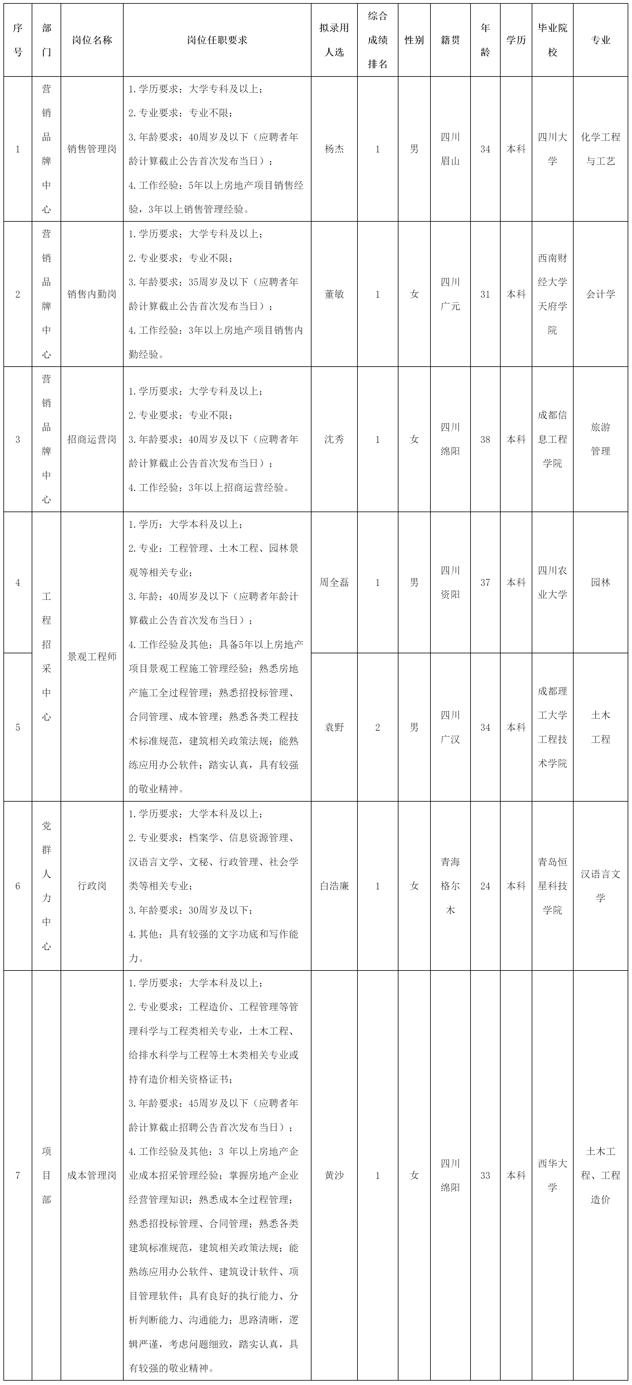 根據(jù)綿陽市綿投置地有限公司發(fā)布的招聘公告及招聘相關(guān)規(guī)定,經(jīng)筆試、面試、考察、體檢等程序,擬錄用楊杰等同志到綿陽市綿投置地有限公司工作,現(xiàn)予以公示,具體情況如下: