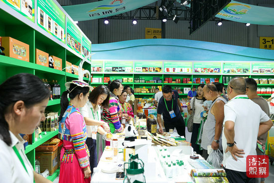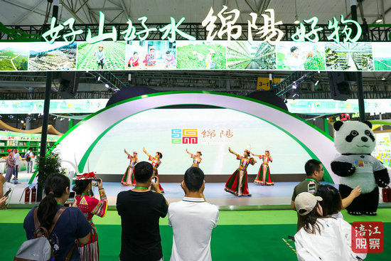 上午10時許,走進(jìn)坐落于3號館的綿陽展區(qū),“好山好水 綿陽好物”的主題大字映入眼簾,身著民族特色服飾的工作人員和大熊貓玩偶熱情地迎接著來往參觀者,集章進(jìn)行“好運乒乓球”的活動前已經(jīng)排起了長隊。展區(qū)里面,米粉、羊肚菌、水果花生、北川苔子茶、江油老鷹茶……各式各樣的特色農(nóng)產(chǎn)品琳瑯滿目。
