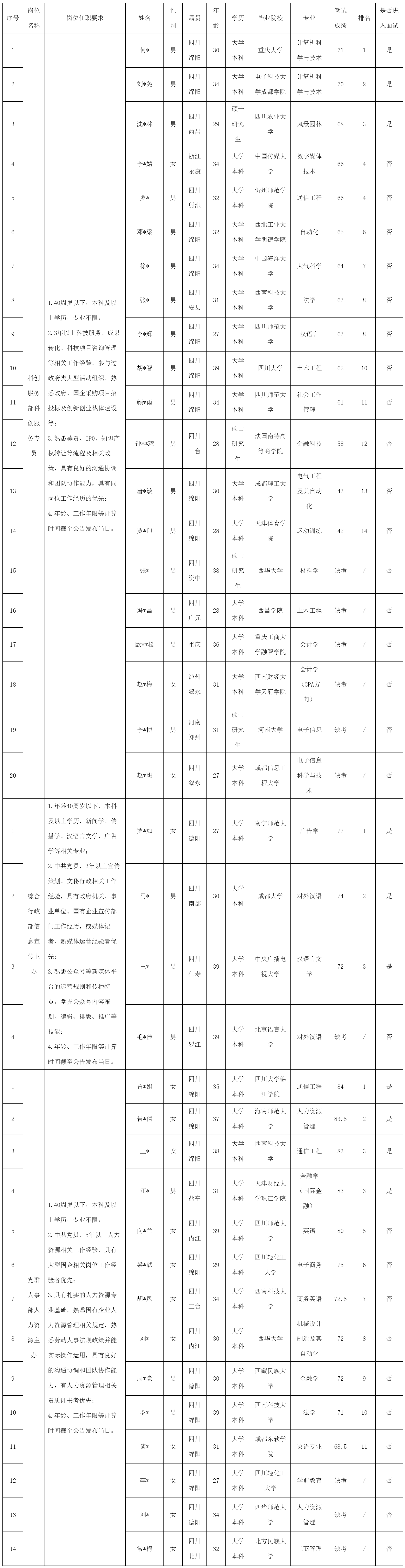 根據(jù)綿陽科技城科技創(chuàng)新投資有限公司發(fā)布的面向社會招聘公司第二批中層管理人員及員工公告及招聘相關規(guī)定,現(xiàn)將筆試成績予以公示。