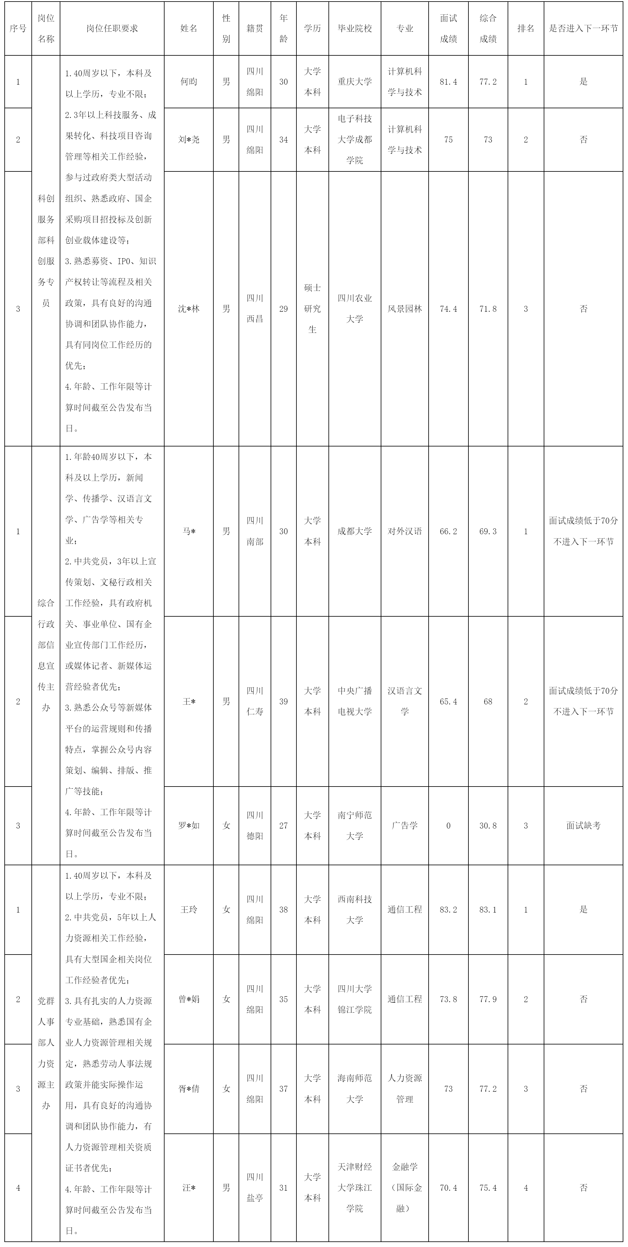 根據(jù)綿陽(yáng)科技城科技創(chuàng)新投資有限公司發(fā)布的第二批中層管理人員及員工招聘公告及招聘相關(guān)規(guī)定,現(xiàn)將綜合成績(jī)予以公示。