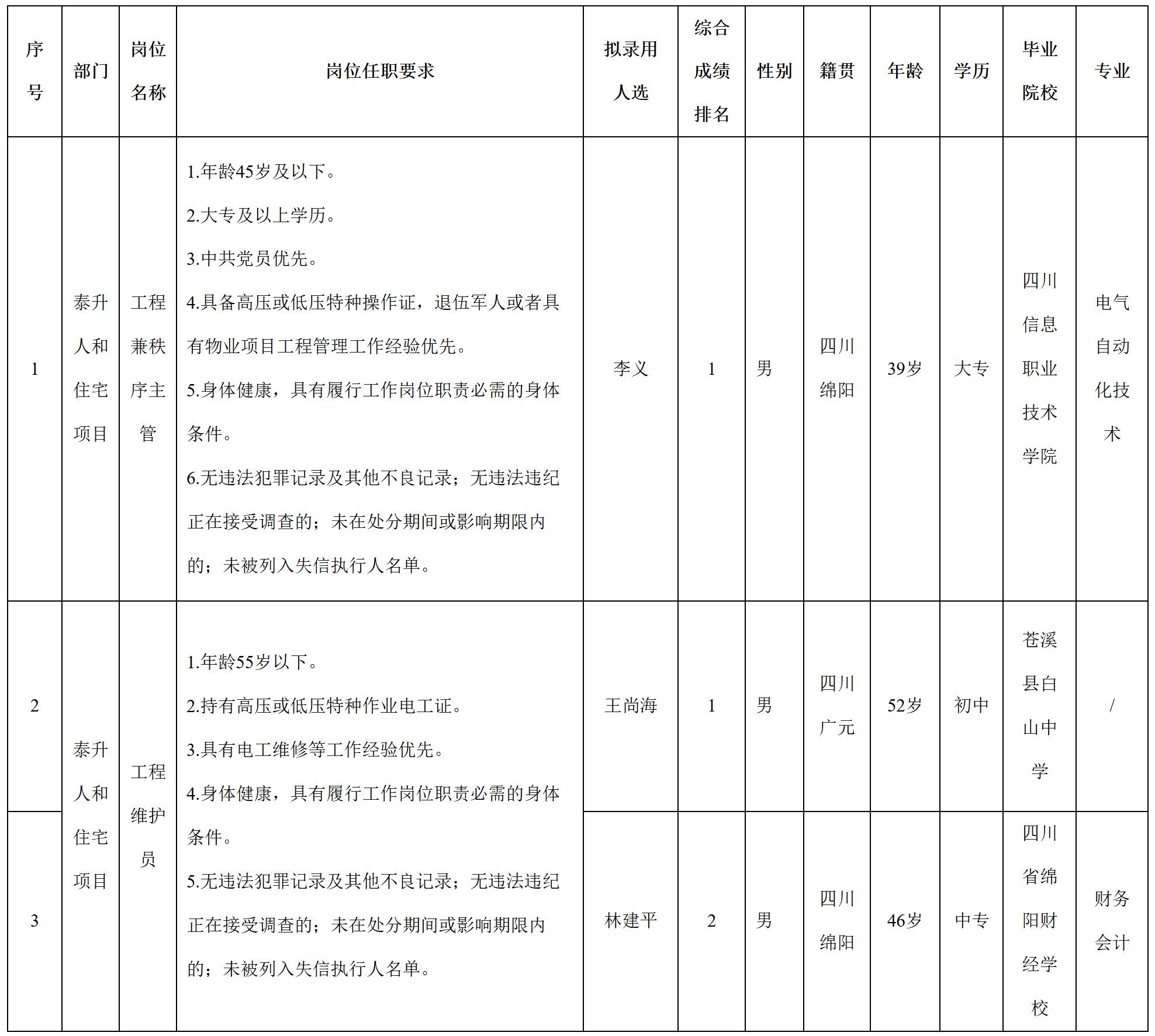 根據(jù)綿陽(yáng)科發(fā)商業(yè)服務(wù)有限公司(原綿陽(yáng)科發(fā)物業(yè)服務(wù)有限公司)發(fā)布的招聘公告及招聘相關(guān)規(guī)定,經(jīng)筆試、面試、考察、體檢等程序,擬錄用李義等3名同志到泰升人和住宅項(xiàng)目工作,現(xiàn)予以公示,具體情況如下:
