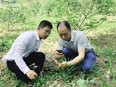 90后“新農(nóng)人”楊文(左)與專家在地里查看中藥材生長情況