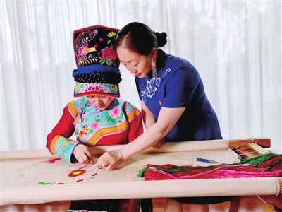 羌繡省級非遺傳承人陳云珍手把手指導學員練習羌繡針法