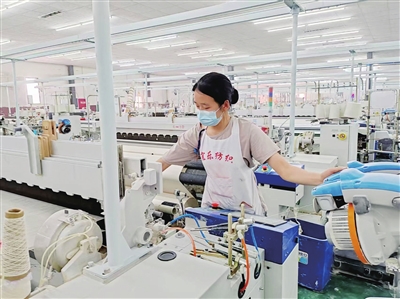 伴隨扎扎機聲,一匹匹光潔的布匹從端口流淌下來,經(jīng)過自動化滾筒,形成一卷卷成品,這是三臺縣宜樂紡織科技有限公司車間的一幕景象。