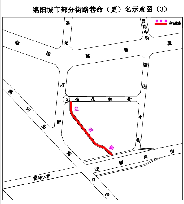 5.蘭花巷:花園南街至荷花南街,東南向西北走向,長約173米,寬約8米。片區(qū)內(nèi)道路專名以花名居多,擬命名“蘭花巷”。(見示意圖3)