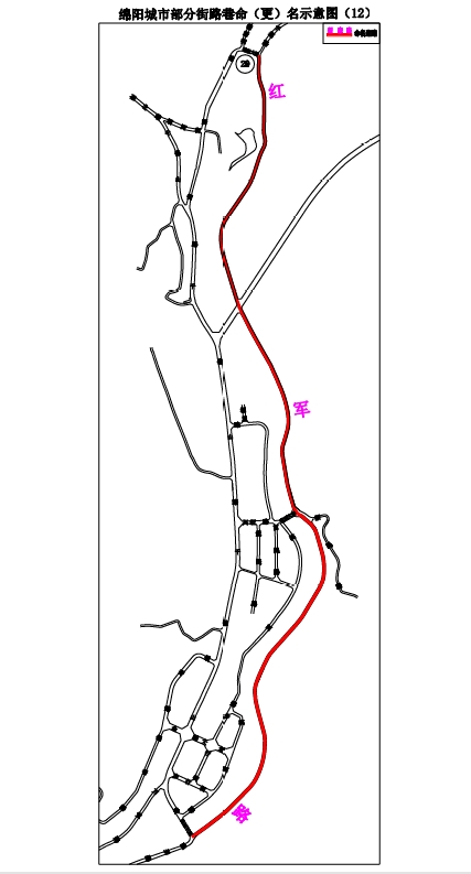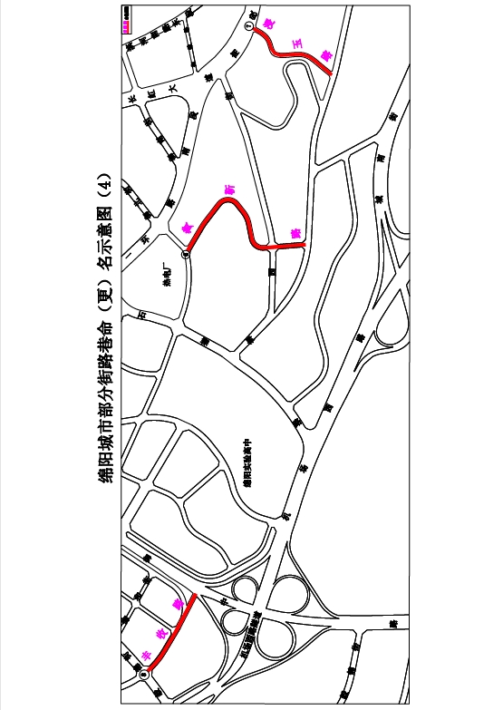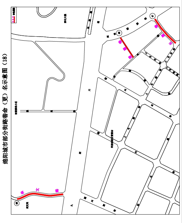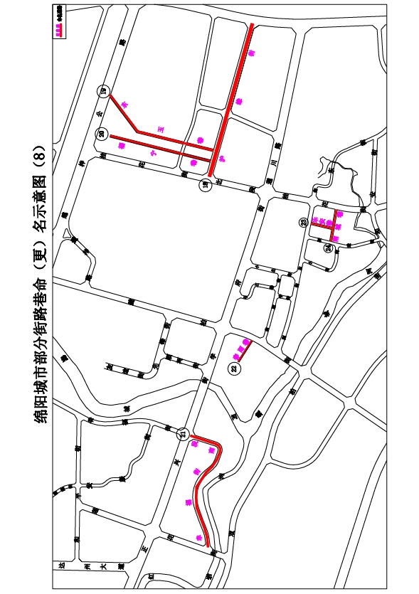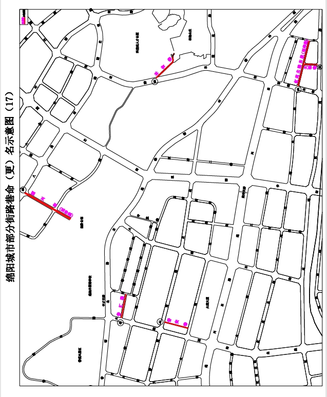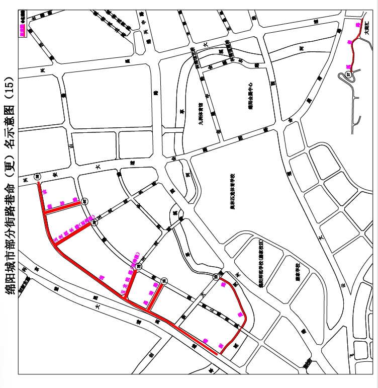 1.一中巷:解放街至綿陽一中,南北走向,長約64米,寬約8米。道路位于綿陽一中后門,擬命名“一中巷”。(見示意圖1)