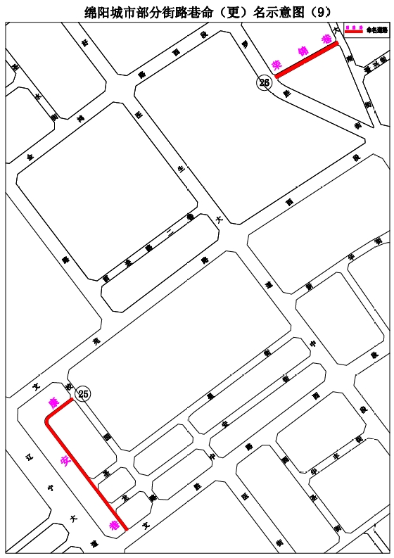 26.榮錦巷:大南街至羅勝街,東西走向,長約300米,寬約12米。道路鄰近集中商貿(mào)區(qū)和學(xué)校,取繁榮欣盛、前程似錦之意,擬命名“榮錦巷”。(見示意圖9)