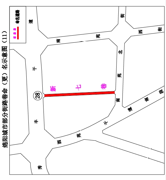 28.新七巷:秀豐干道至南苑北街,南北走向,長約130米,寬約4米。道路位于原新民村七組,村級(jí)建制調(diào)整后,新民村合并為城南村,為保留歷史記憶,擬命名“新七巷”。(見示意圖11)