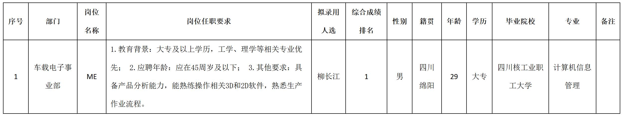 根據(jù)四川九州電子科技股份有限公司發(fā)布的招聘公告及招聘相關規(guī)定,經(jīng)筆試、面試、考察、體檢等程序,擬錄用柳長江同志到四川九州電子科技股份有限公司工作,現(xiàn)予以公示,具體情況如下: