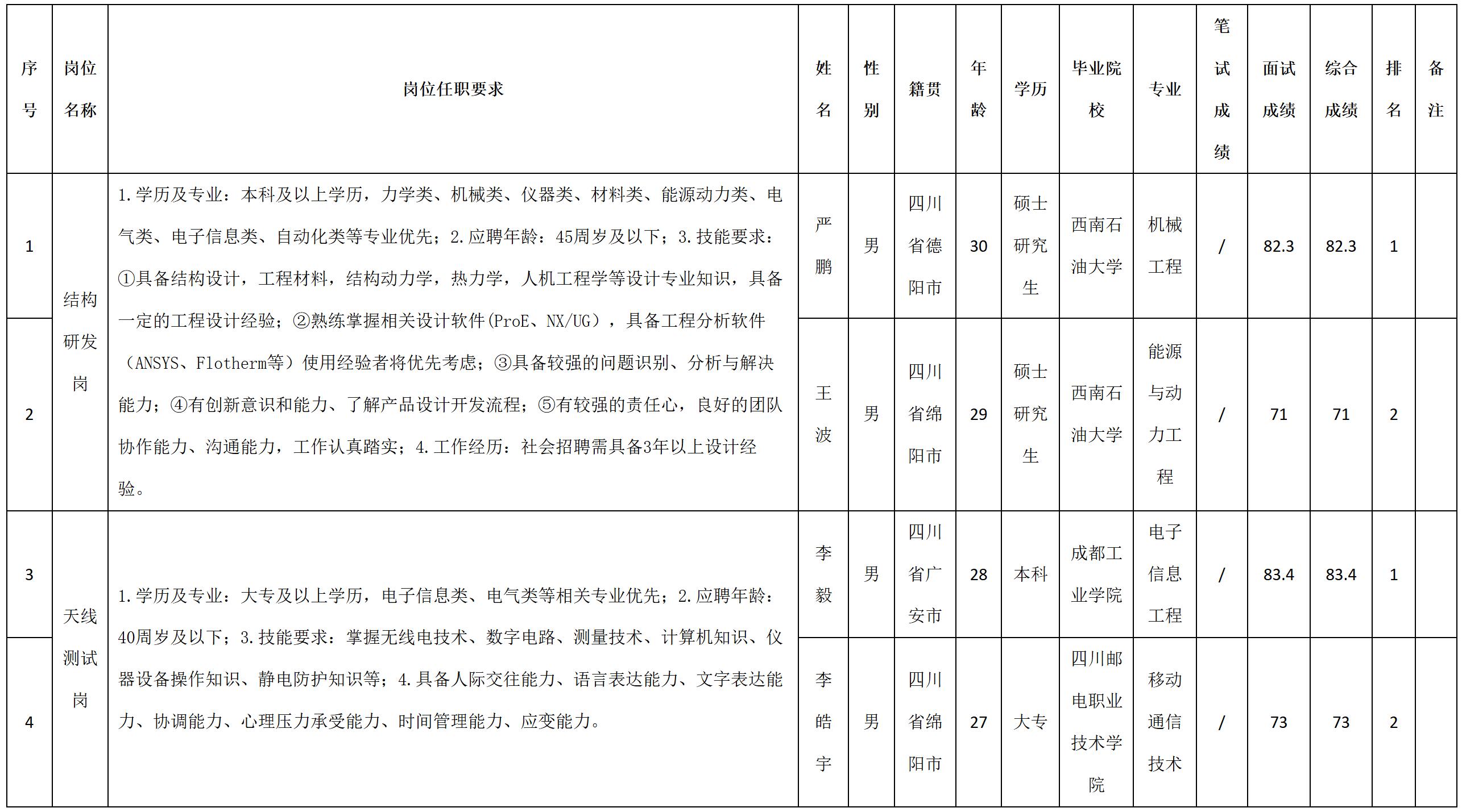 根據(jù)四川九洲電器集團(tuán)有限責(zé)任公司發(fā)布的招聘公告及招聘相關(guān)規(guī)定,經(jīng)筆試、面試等程序,現(xiàn)將筆試(面試)成績(jī)予以公示。