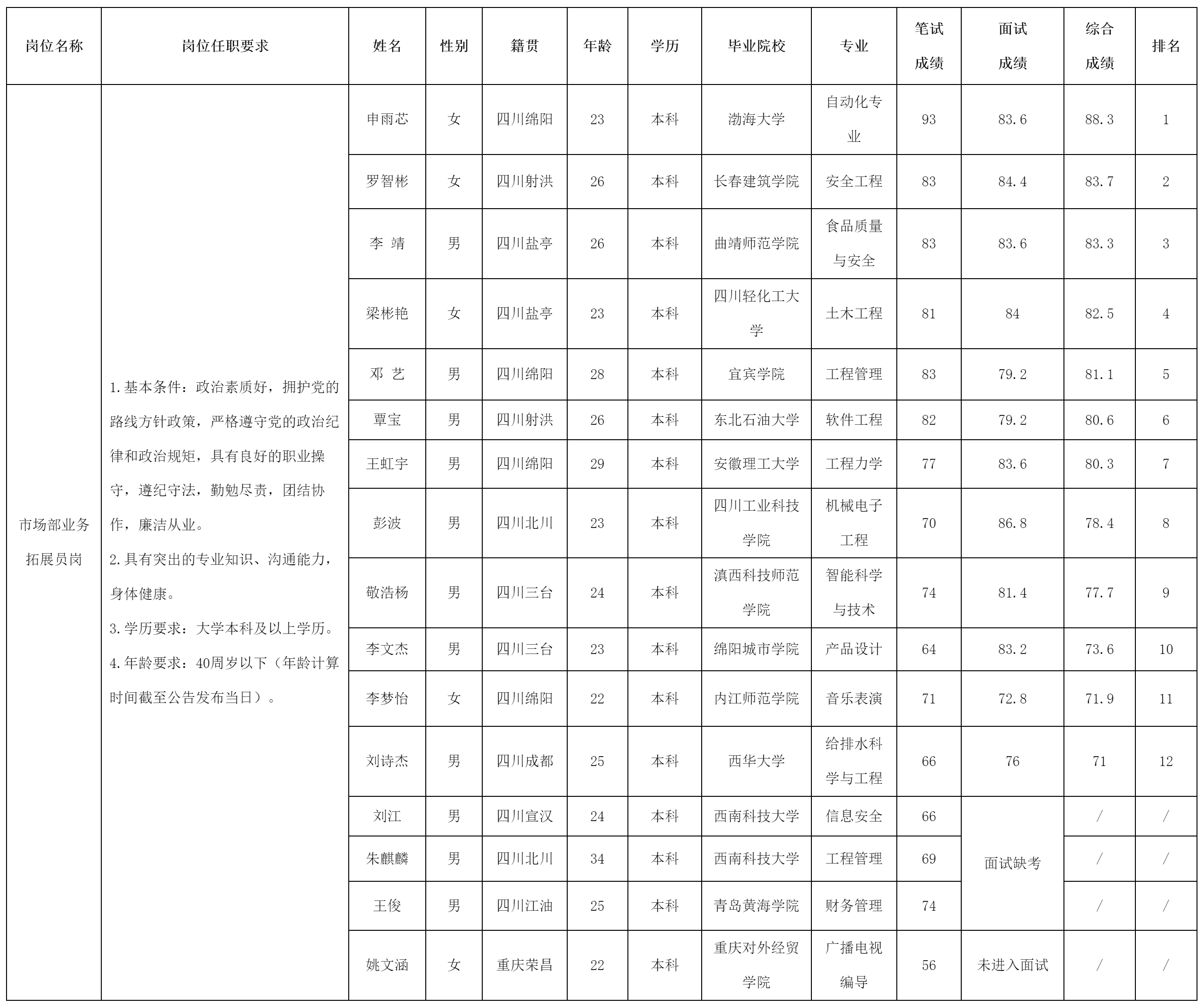 根據(jù)綿陽市建設(shè)工程質(zhì)量檢測中心有限責(zé)任公司發(fā)布的招聘公告及招聘相關(guān)規(guī)定,現(xiàn)將筆試(面試)成績予以公示。