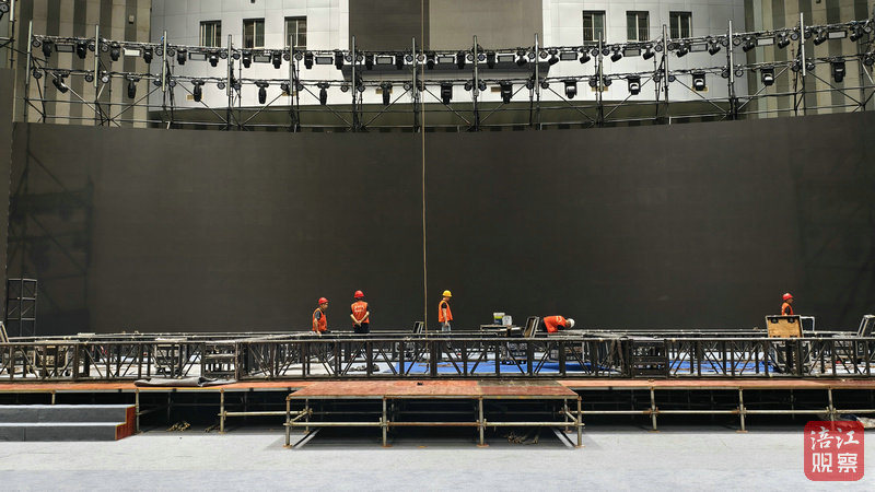 鋼琴與人形機(jī)器人背后的開幕式主舞臺上,巨大的異形主屏幕結(jié)構(gòu)已初具規(guī)模,工人們正進(jìn)行最后的吊頂和異形梯步搭建。綿陽科發(fā)會展旅游有限責(zé)任公司副總經(jīng)理張琨向記者透露,預(yù)計將于今晚或明日凌晨完成主會場搭建工作。