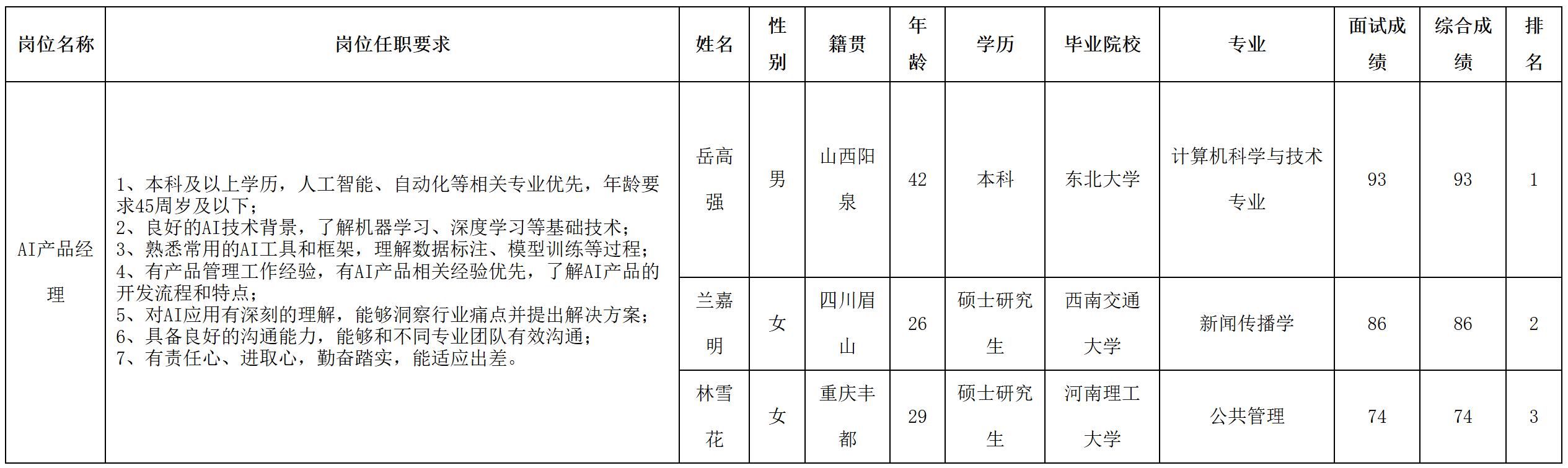 根據(jù)四川長(zhǎng)虹虹微科技有限公司發(fā)布的招聘公告及招聘相關(guān)規(guī)定,經(jīng)面試等程序,現(xiàn)將面試成績(jī)予以公示。
