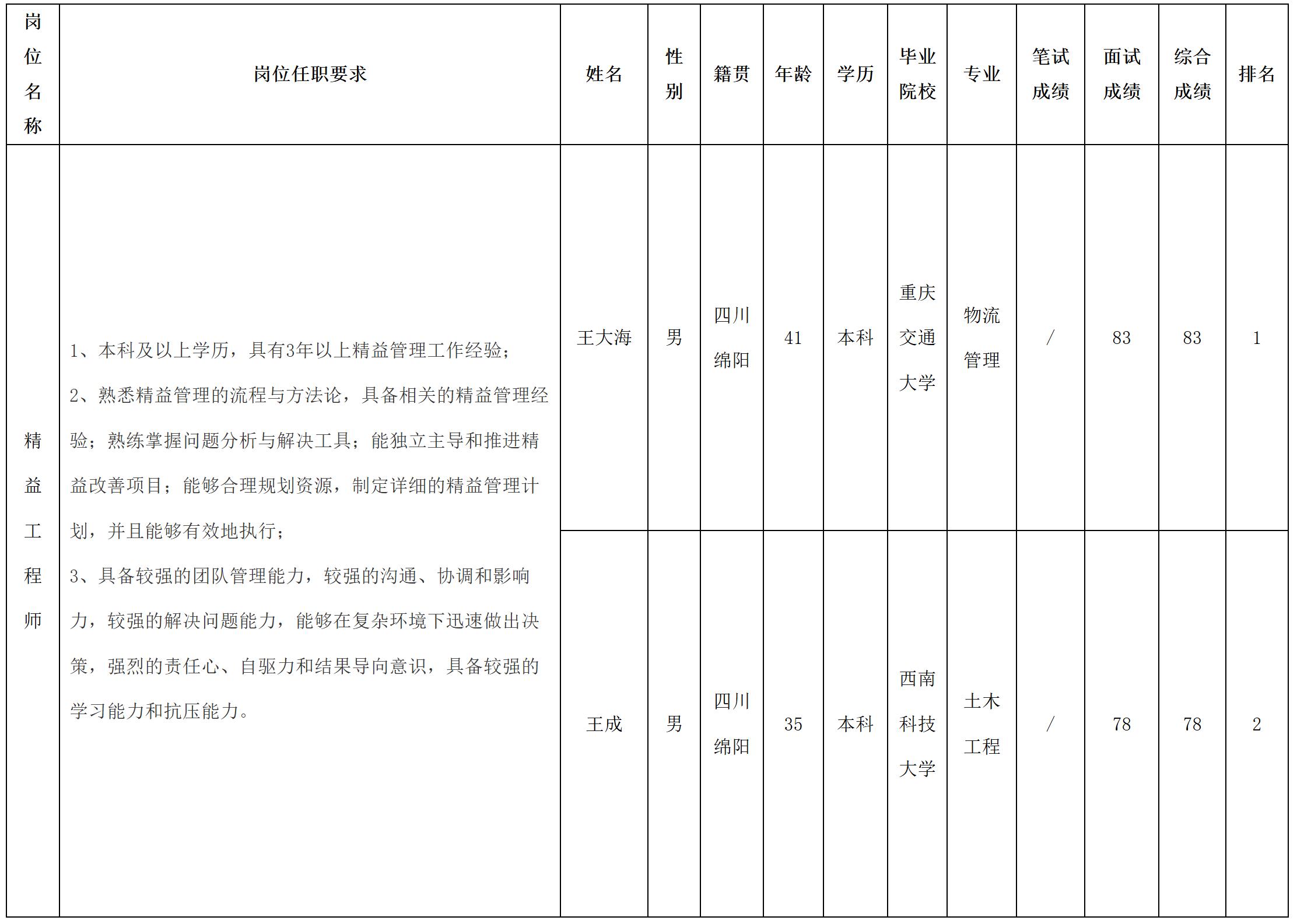 根據(jù)四川華豐科技股份有限公司發(fā)布的招聘公告及招聘相關(guān)規(guī)定,經(jīng)筆試、面試等程序,現(xiàn)將筆試(面試)成績予以公示。