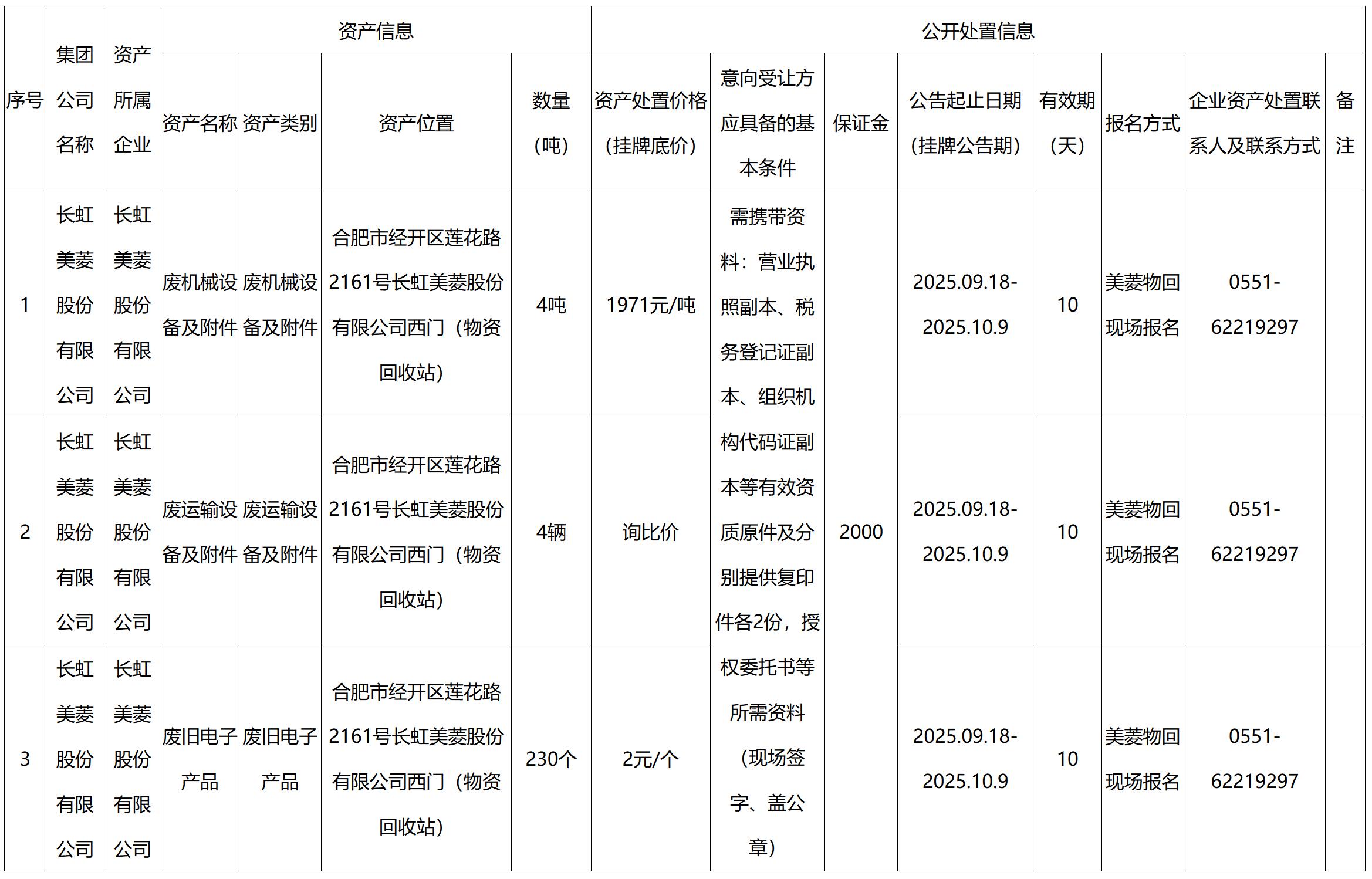 長虹美菱股份有限公司資產(chǎn)處置公告