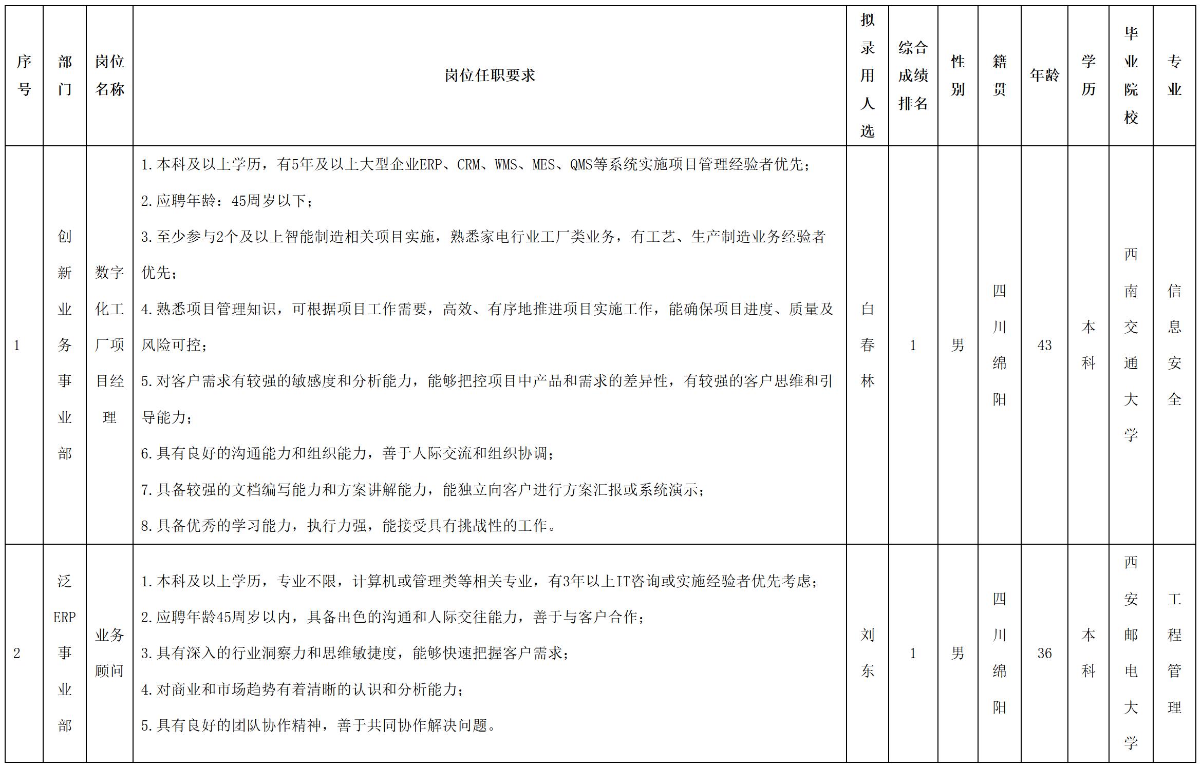 根據(jù)四川虹信軟件股份有限公司發(fā)布的招聘公告及招聘相關規(guī)定,經(jīng)面試、考察、體檢等程序,擬錄用白春林、劉東同志到四川虹信軟件股份有限公司工作,現(xiàn)予以公示,具體情況如下: