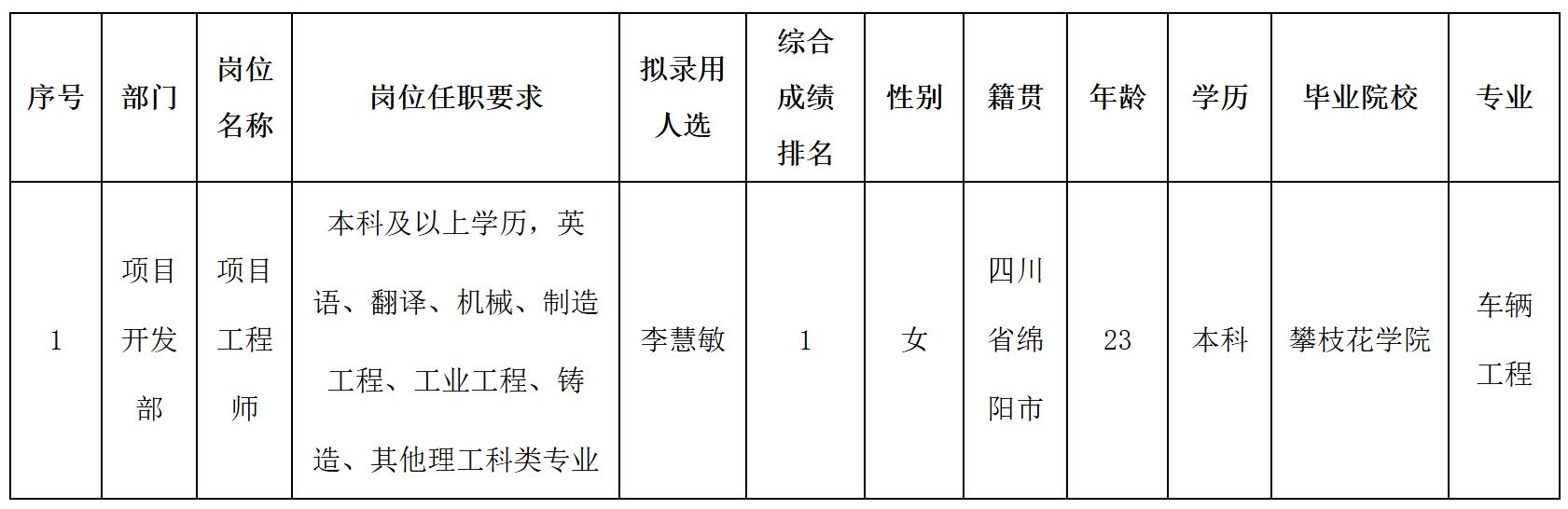 根據(jù)四川波鴻實業(yè)有限公司發(fā)布的招聘公告及招聘相關(guān)規(guī)定,經(jīng)面試、體檢等程序,擬錄用李慧敏同志到四川威斯卡特工業(yè)有限公司綿陽分公司工作,現(xiàn)予以公示,具體情況如下: