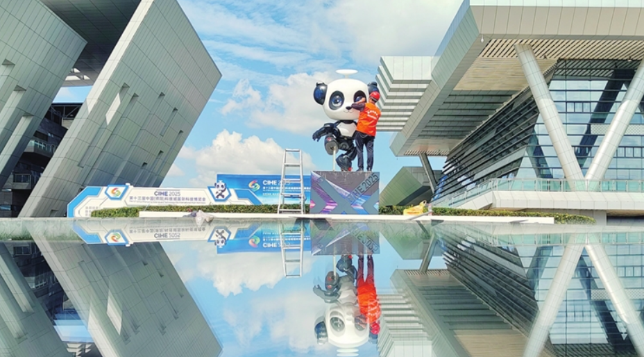 9月23日,工作人員正在會(huì)展中心安裝科博會(huì)形象大使“科寶”。