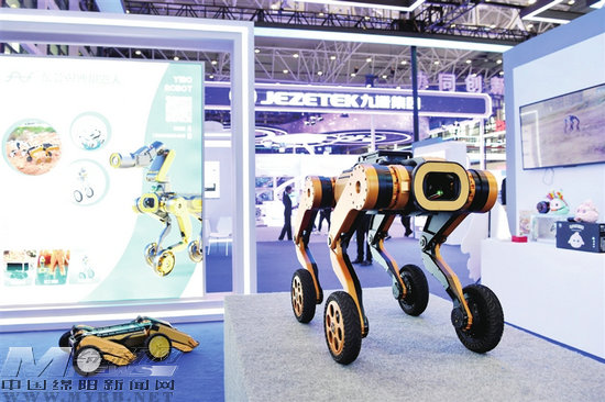 在B館,記者注意到一款四足機(jī)器人,它與一般的四足機(jī)器人有所不同,它的足部是四個(gè)輪子。在工作人員的操作演示和宣傳片的展示下,記者了解到,它既能像常見的四足機(jī)器人一樣步行,在沒有高度差的地面又能用輪子滑行,十分靈活。